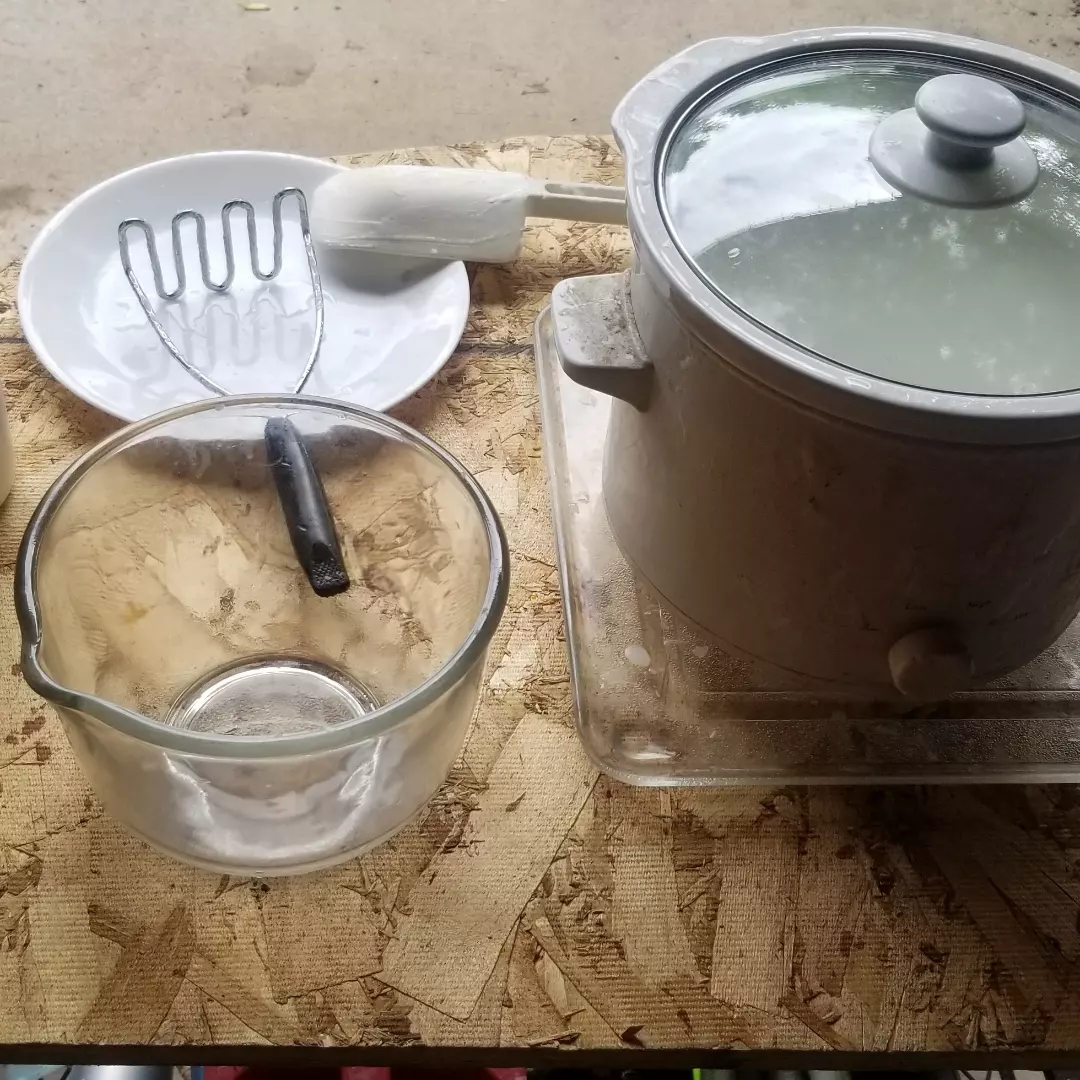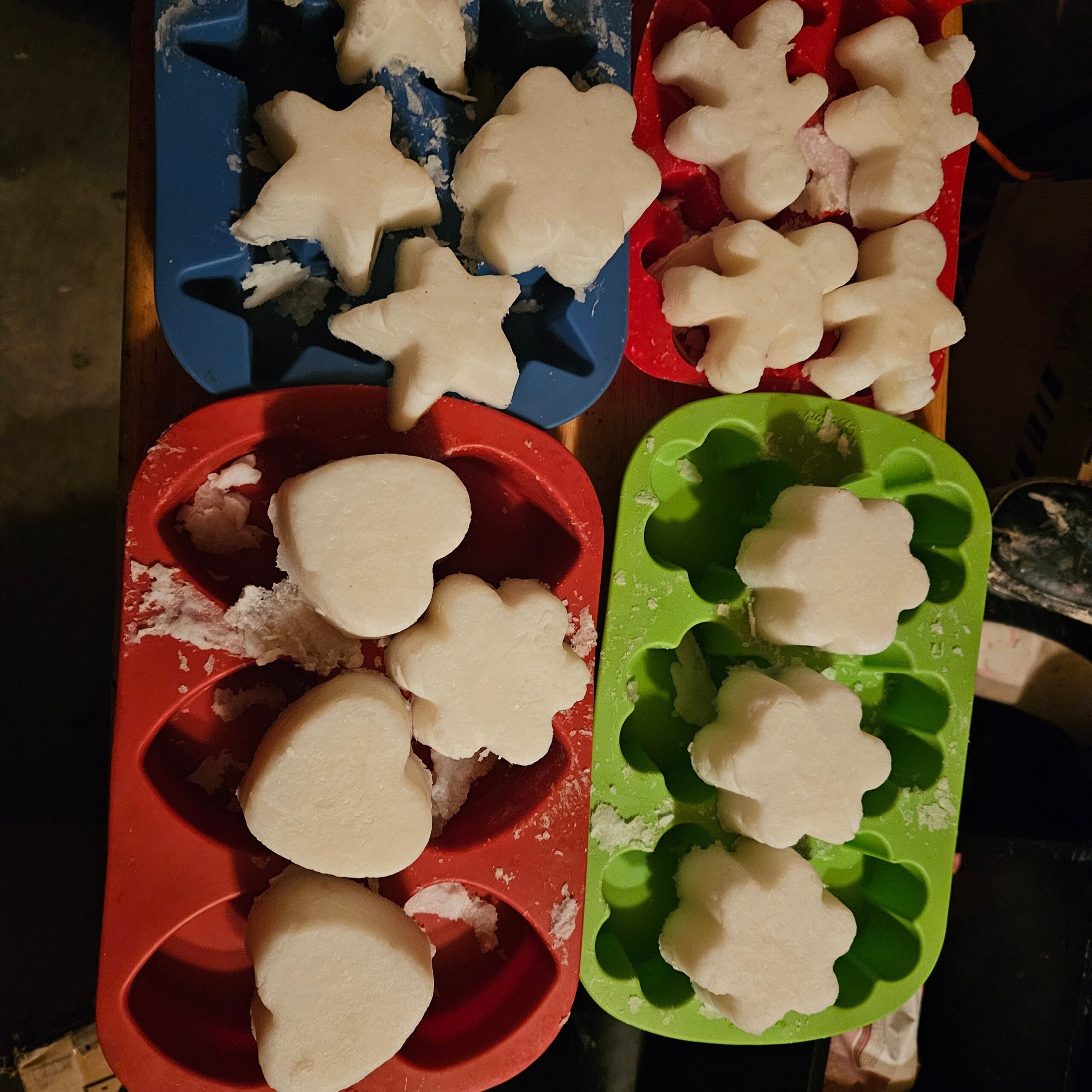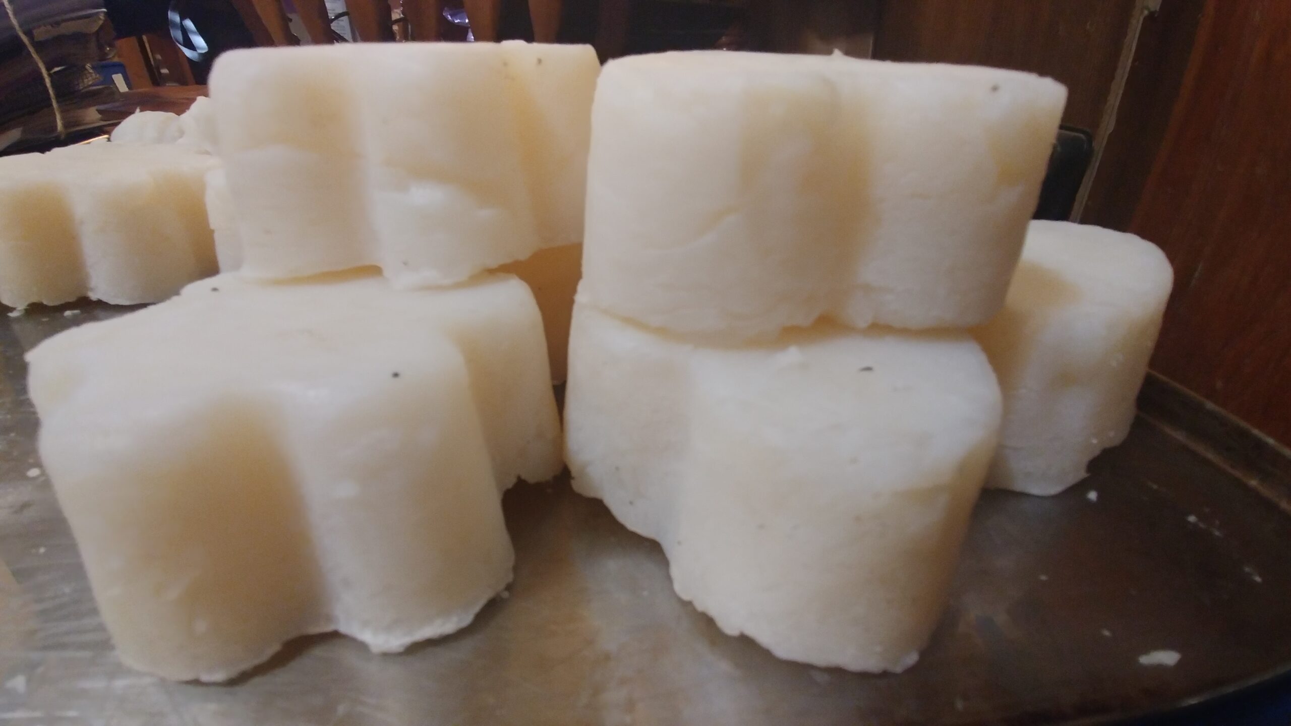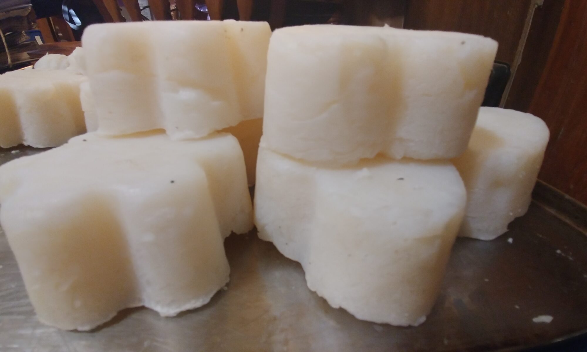 This ‘superfat’ soap is heated in a crockpot, saponified in an hour, poured into silicon molds using no releasing agents, and can be used as soon as it’s dry.